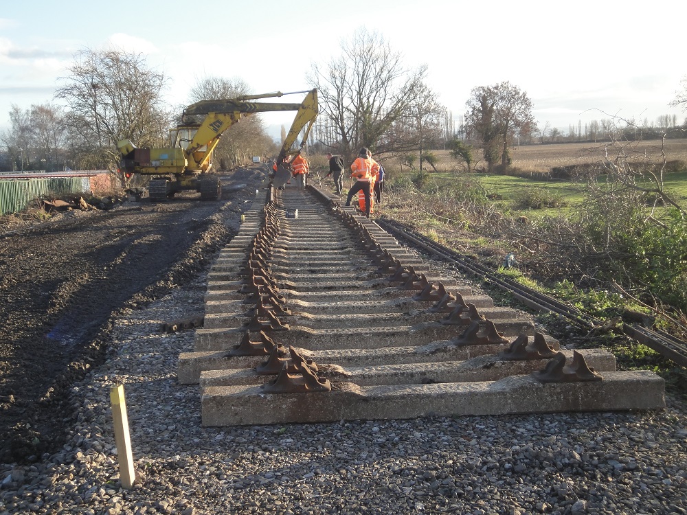 A bit further south the concrete sleepers are being moved in to position and given a final nudge to maintain the alignment.
